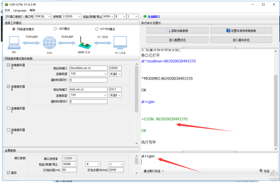 6. 再發送at+cgsn加回車,檢查一下剛才發送的是否成功。如下圖所示