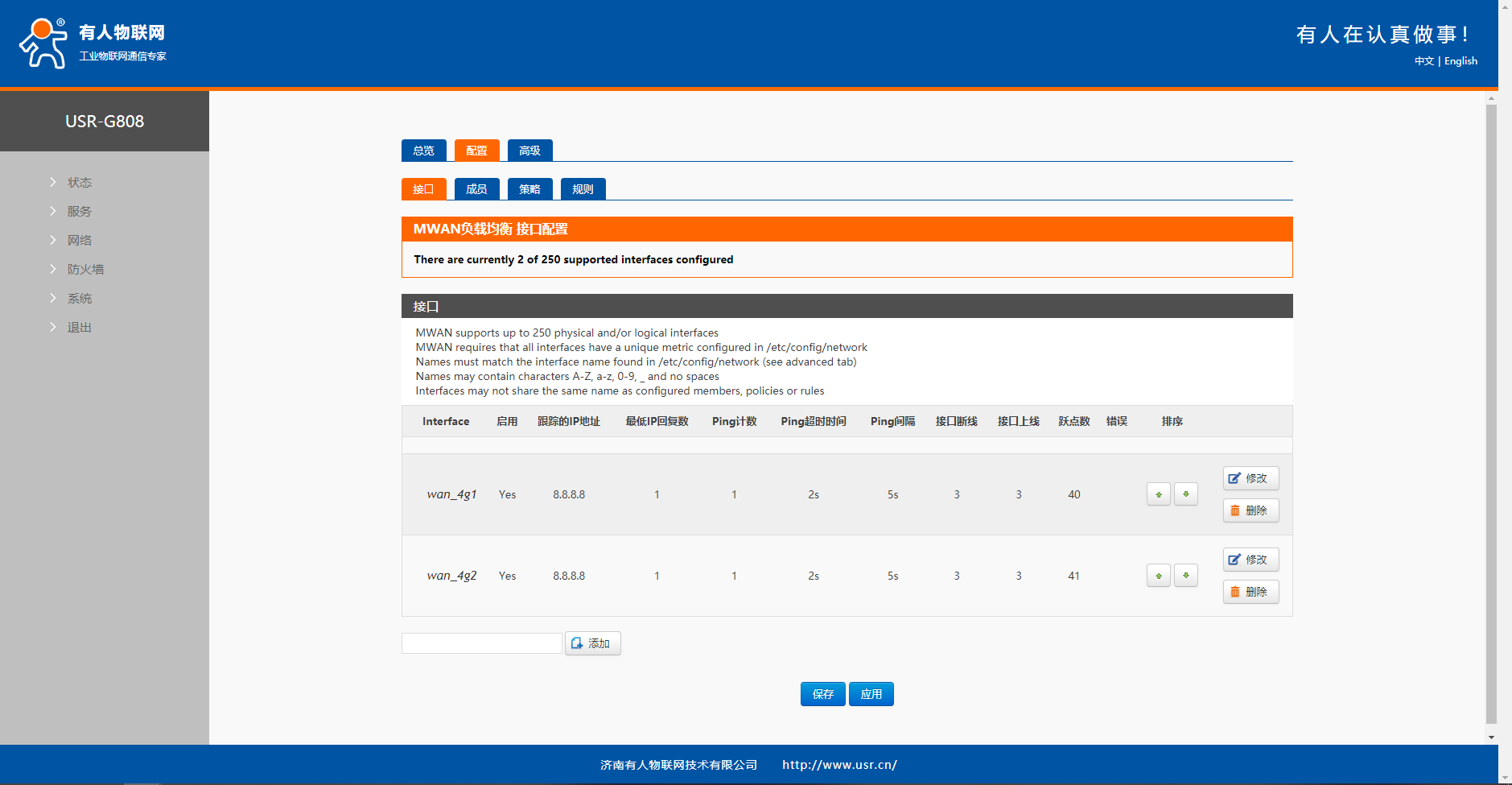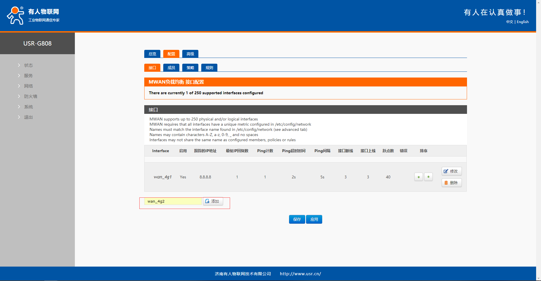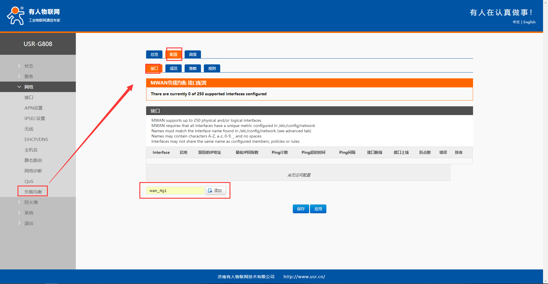 點擊配置----接口,創建接口兩個(接口名稱可以自定義),這里是 wan_4g1 和 wan_4g2 后,點擊添加。注意:這個接口的名字必須和上面的接口處的名字一樣。