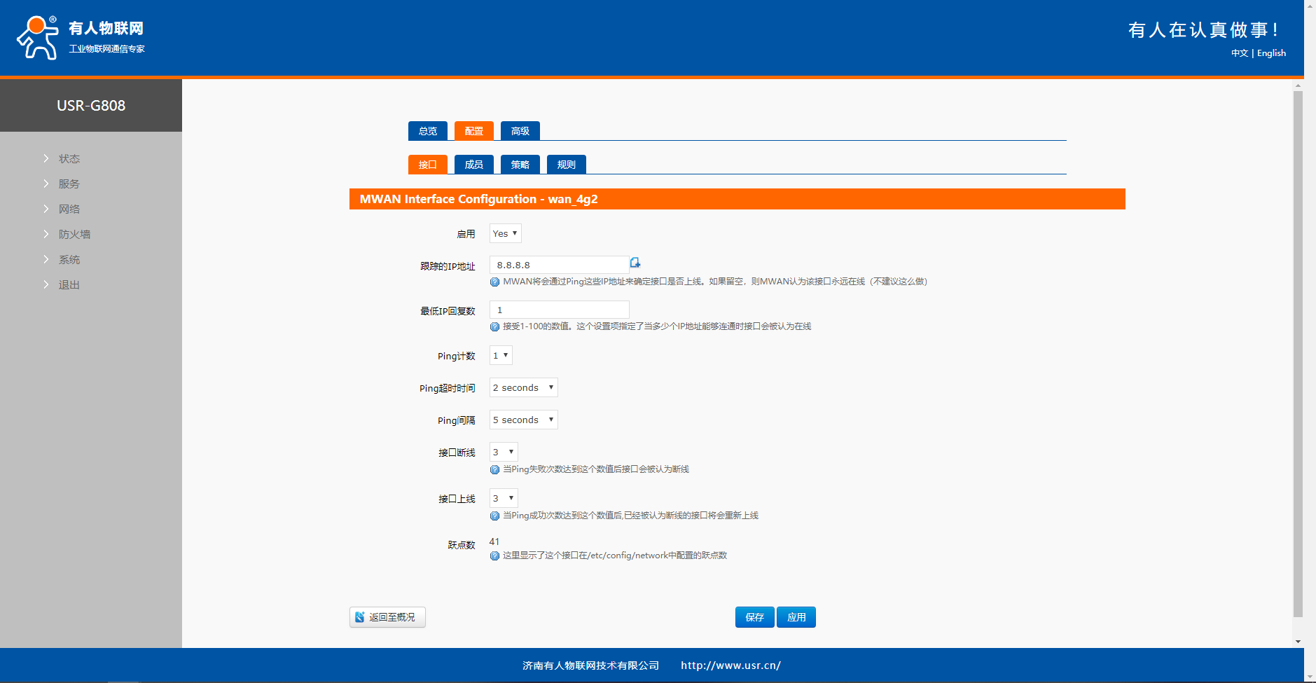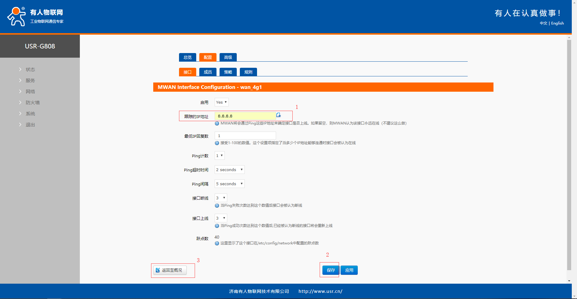 界面跳轉,設置跟蹤的IP地址為8.8.8.8,然后點擊保存,保存完畢后點擊返回至概況跳轉至添加接口界面繼續添加接口2,步驟與上述一致。