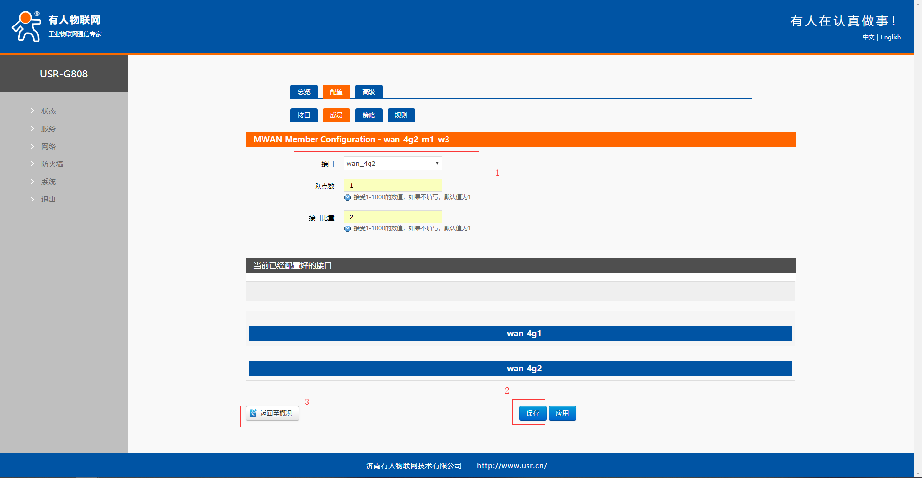 頁面跳轉,接口選擇對應的接口,躍點數填1,接口比重填3(可自定義),設置完成后點擊保存,然后返回至概況。