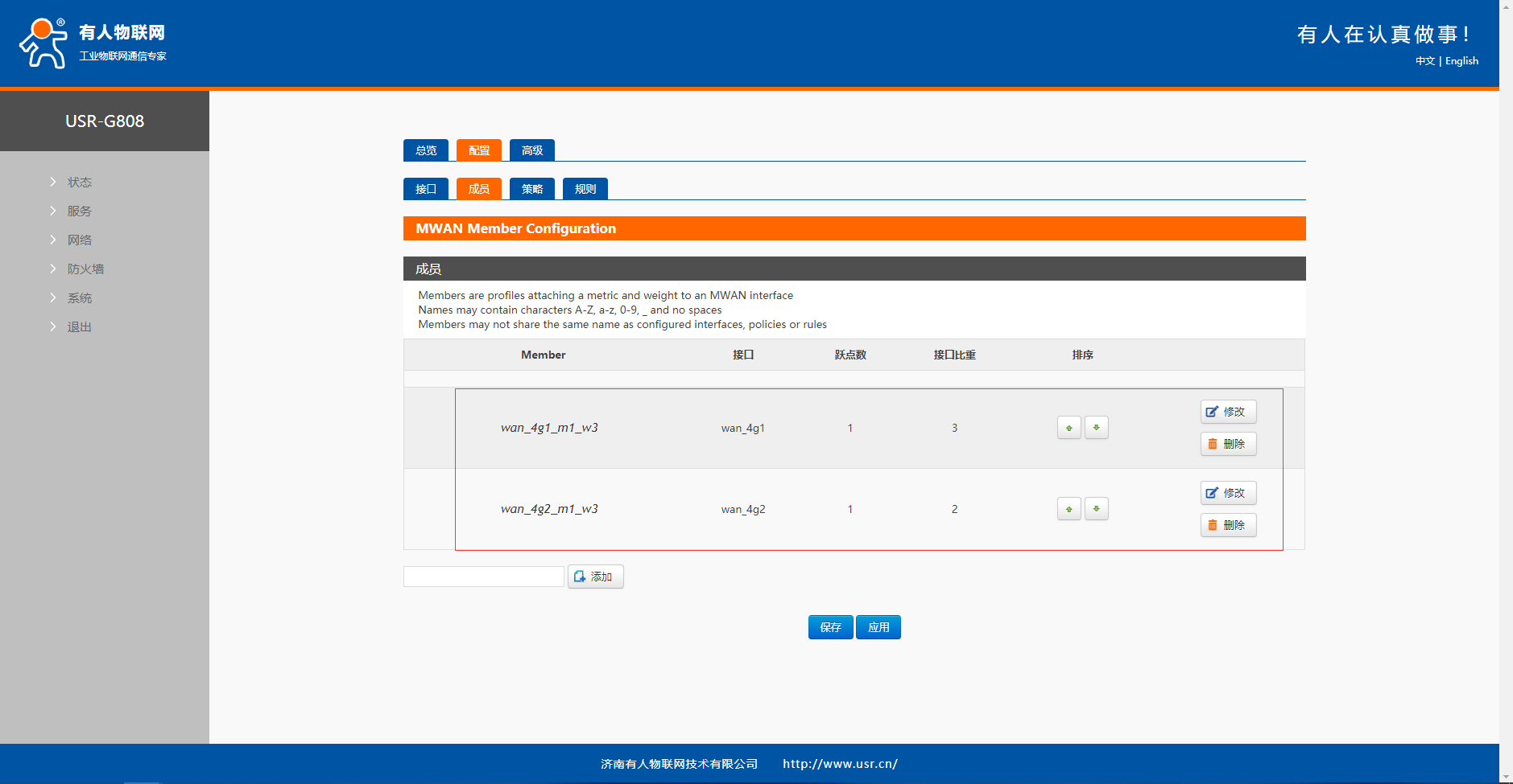 點擊配置----成員進入成員配置界面。添加成員(成員名稱可以自定義),這里是 wan_4g1_m1_w3 和 wan_4g2_m1_w3 后,點擊添加