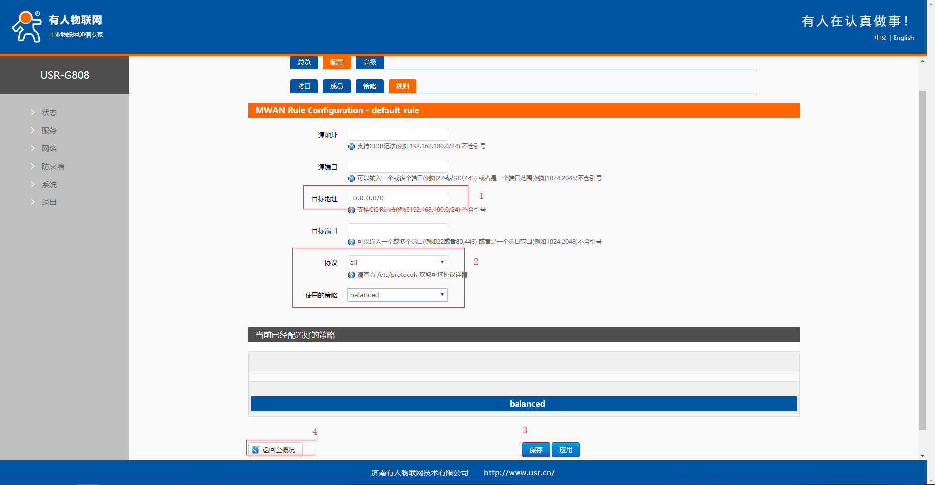 界面跳轉,目標地址設置為0.0.0.0/0,協議選擇all,使用策略選擇上步添加的策略“balanced”。設置完成后,點擊保存,保存完畢后返回至概況。