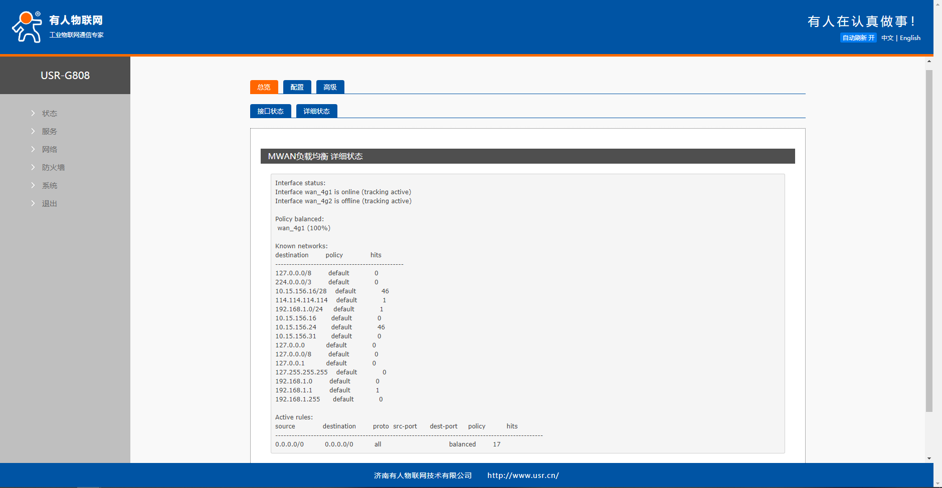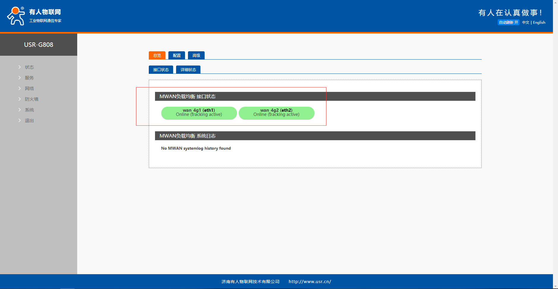 待設備重啟完畢后,可以在總覽里點擊接口狀態,發現兩個接口變成綠色表示配置成功,紅色表示沒有成功。在詳細狀態里面可以看到兩個接口的進行的負載占比。