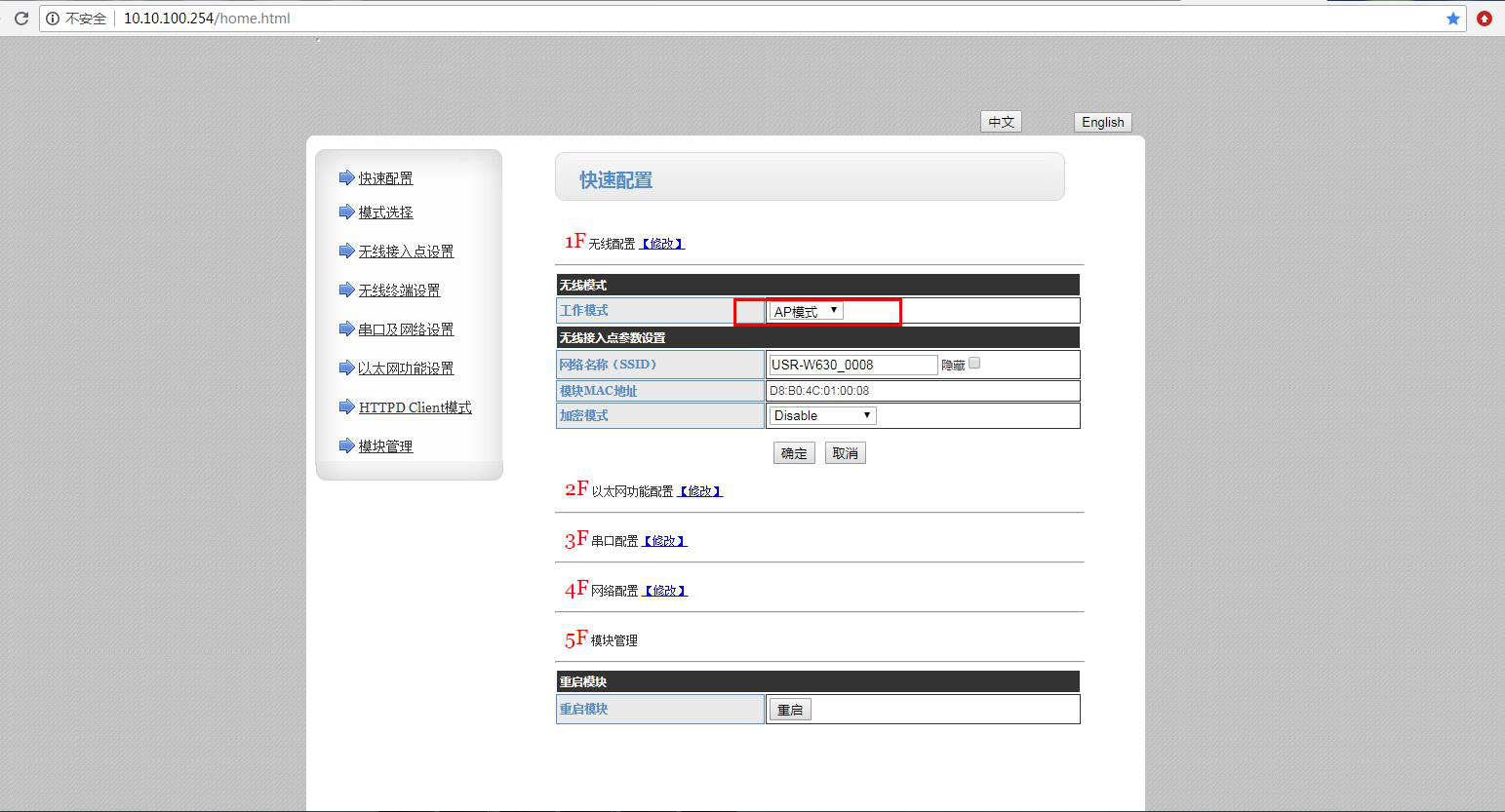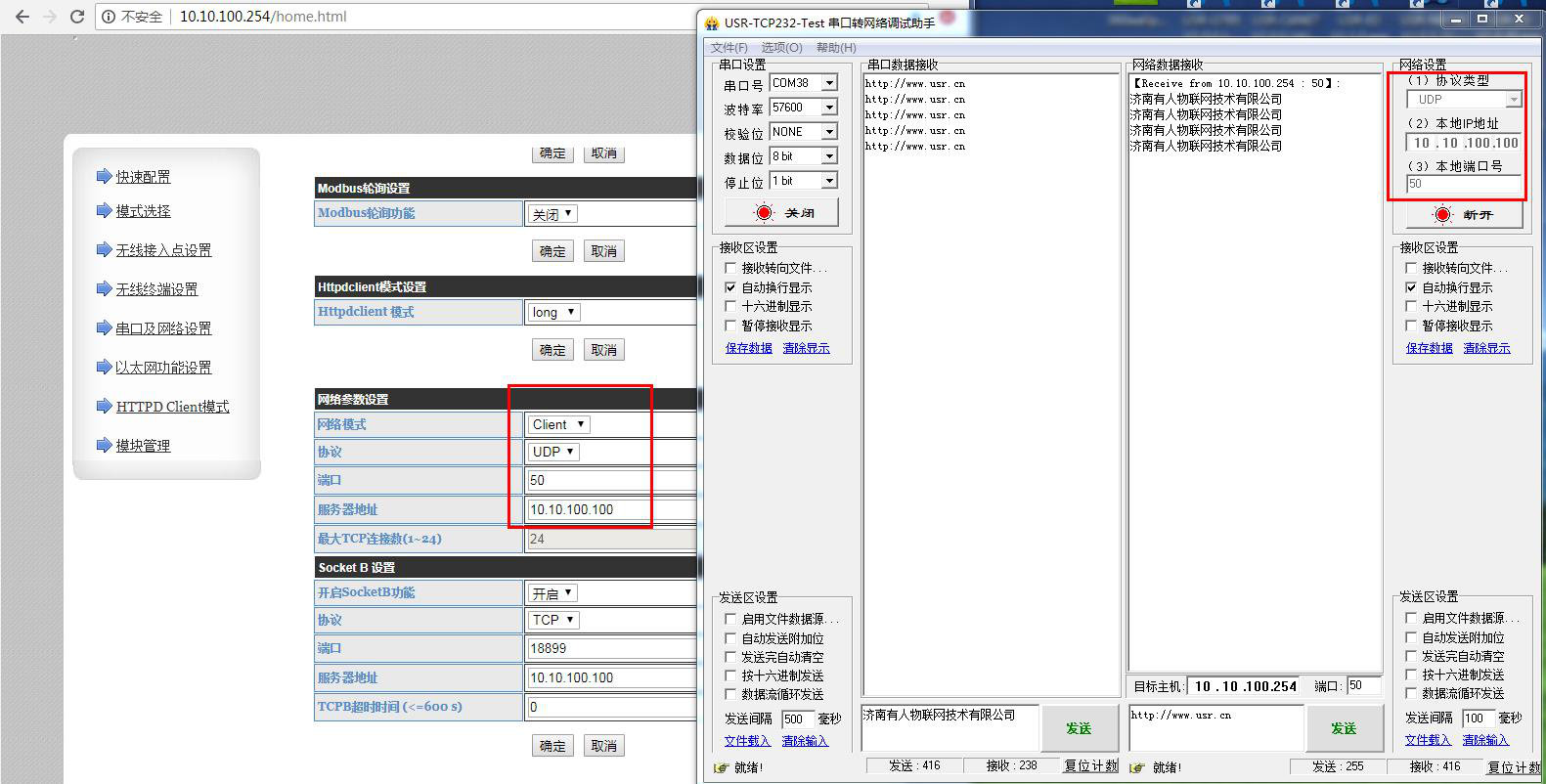 用USR-W610的IP 10.10.100.254 登錄USR-W610的網(wǎng)頁(yè),然后修改W610的串口參數(shù)。測(cè)試4種工作模式下,串口和網(wǎng)絡(luò)的數(shù)據(jù)透?jìng)鳌?/p>