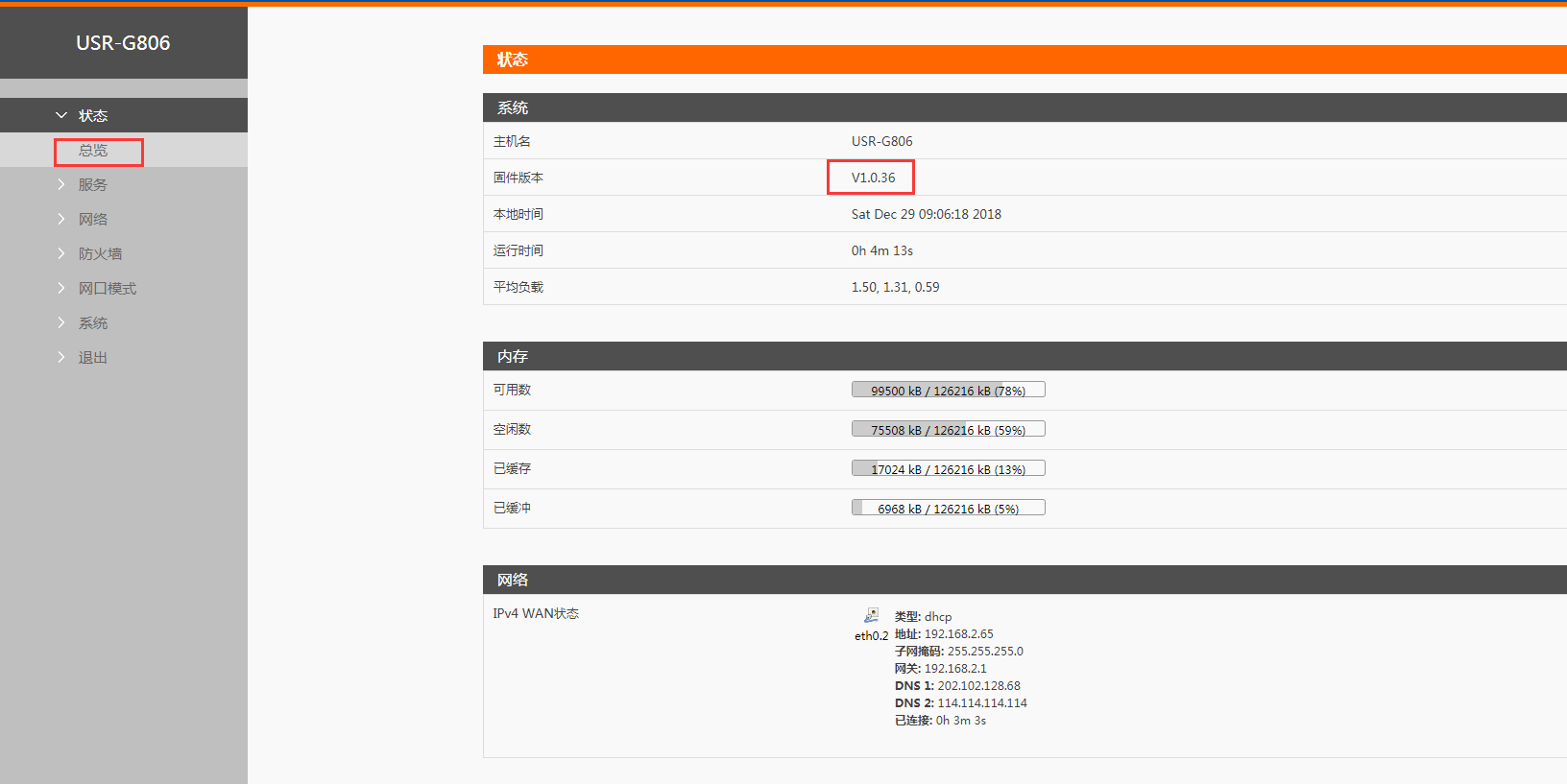 2、 在狀態-->總覽里邊可以看到固件版本號V1.0.36,現在升級到V1.0.38版本。