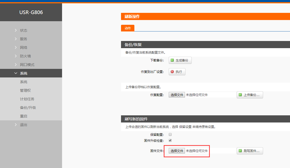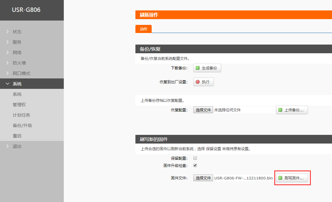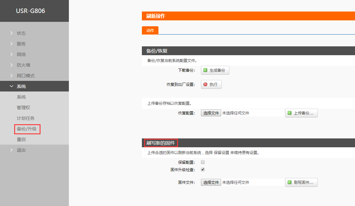 3、在系統中選擇備份/升級選項,可以看到有刷寫新的固件的選項卡。