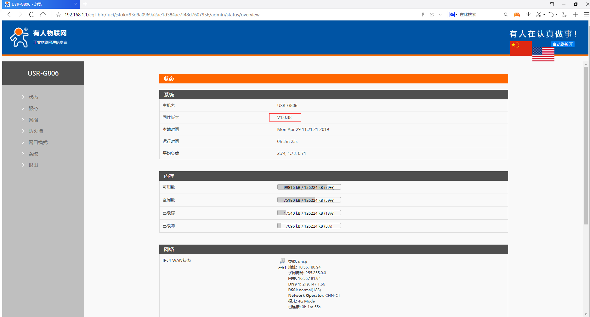 等待大約2分鐘,重新登錄界面,查看版本號,已經升級到V1.0.38。