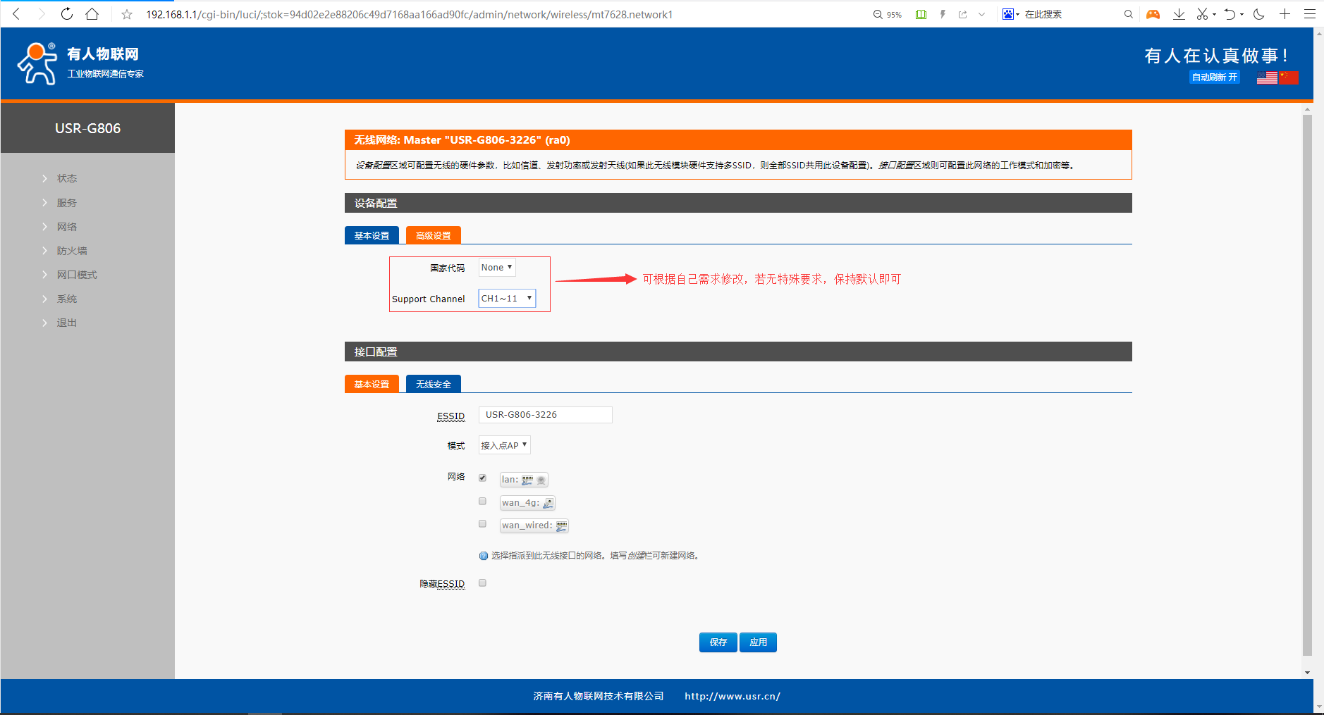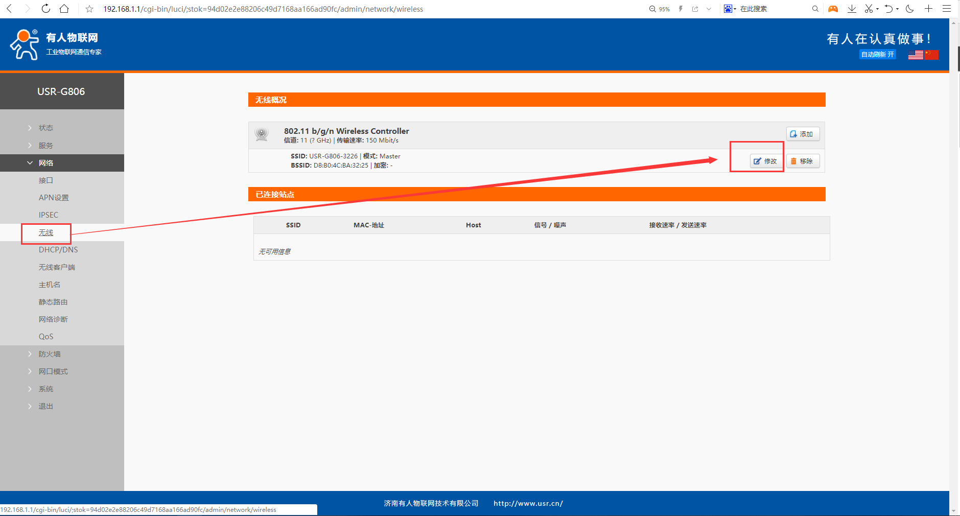 1、 將工業路由器G806上電后進入設置界面,在左側的“網絡”——“無線”命令下,點擊對應的修改按鈕,進入WiFi的參數修改界面
