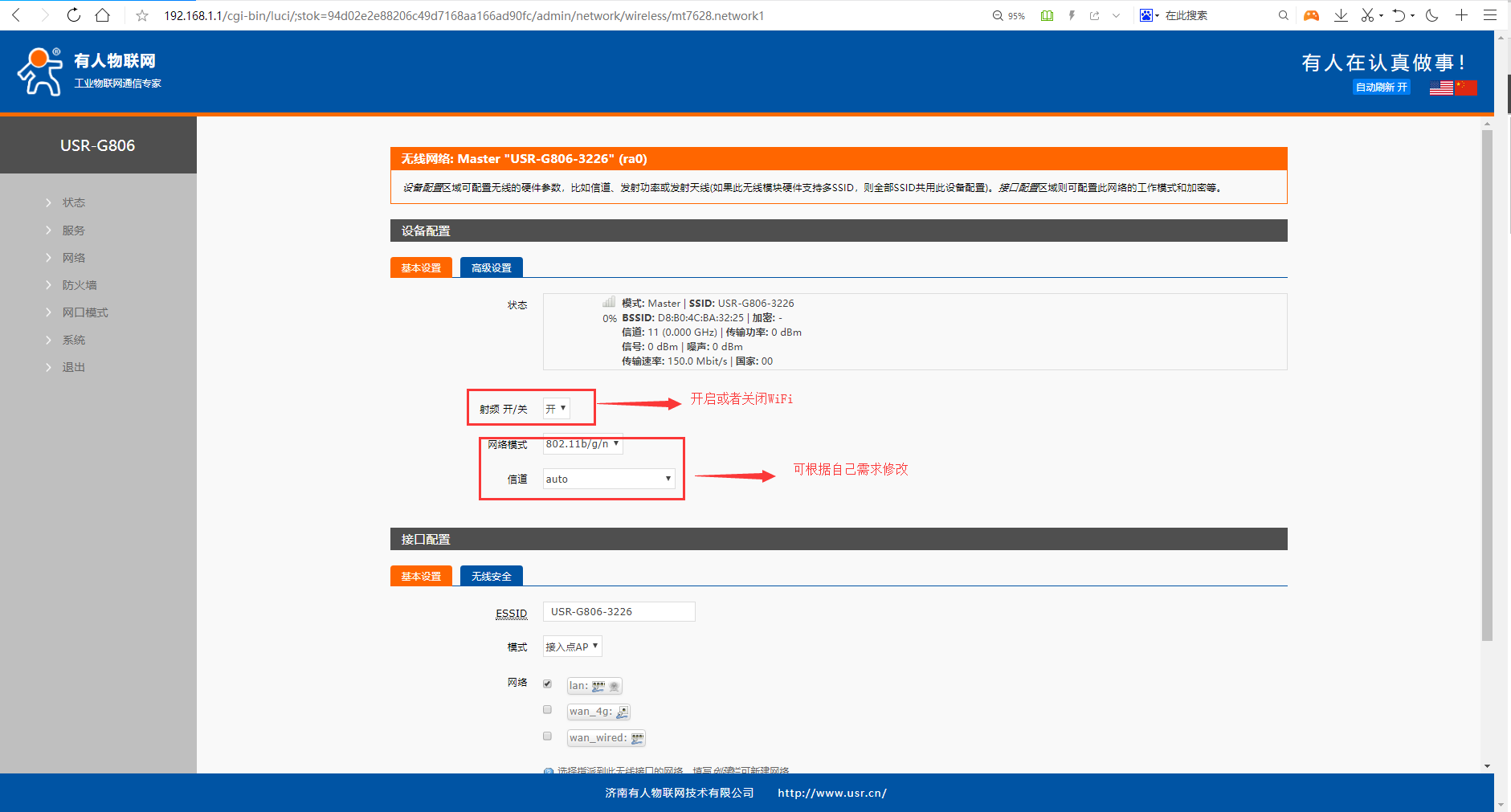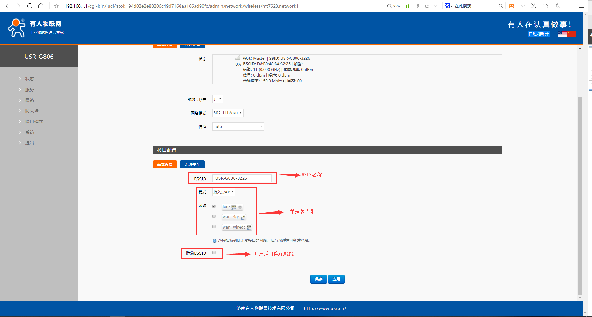 4、 在接口配置----基本設置中,ESSID即WiFi信號的名稱,默認為設備型號+MAC后4位。