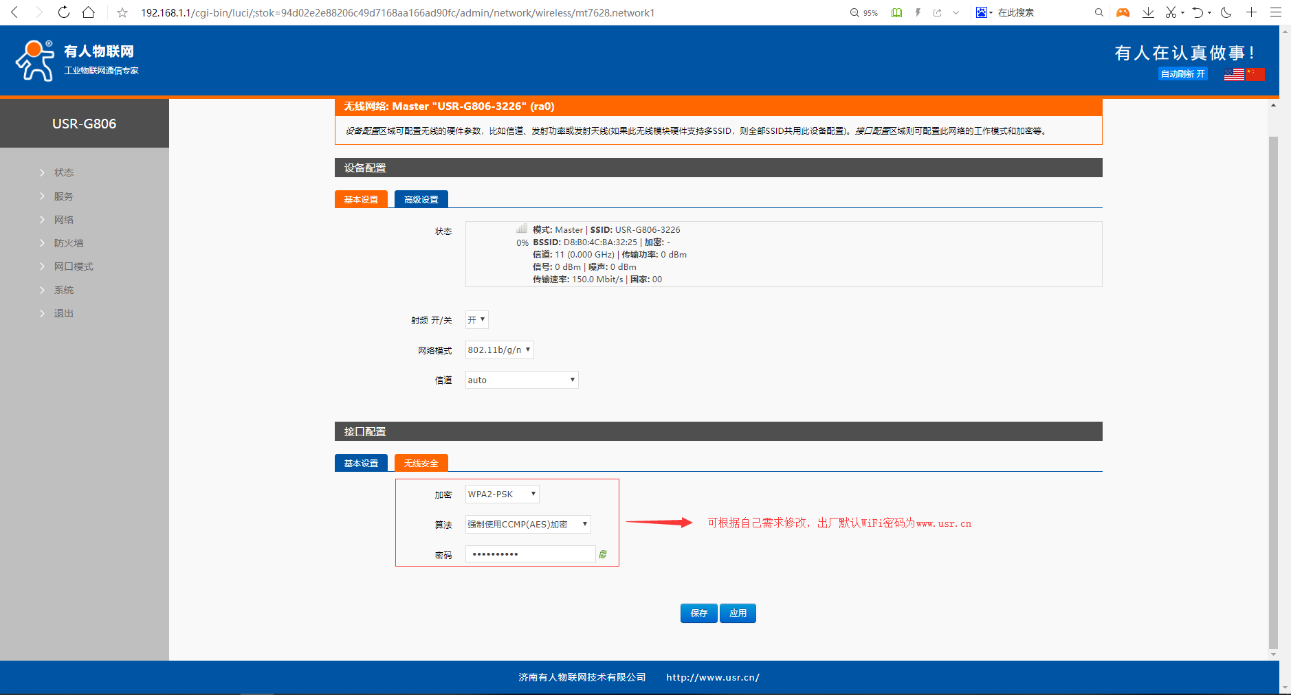 5、 在接口配置---無線安全中可以修改該WiFi的加密方式,默認加密方式為WPA2-PSK,默認密碼為www.qzjcgc.com