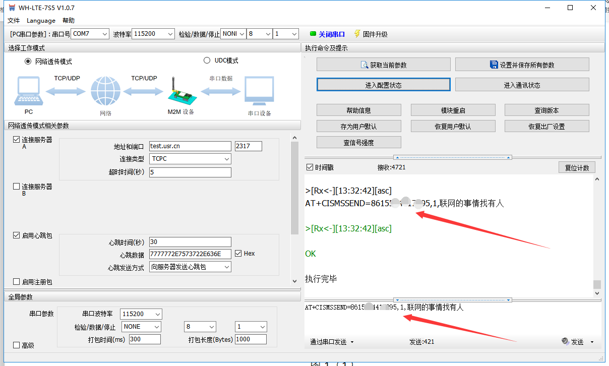 1.4g模塊7s5上電,串口與電腦連接,放入sim卡,(注:物聯(lián)卡不能發(fā)短信),點擊打開串口,點擊進入配置狀態(tài),返回ok表示進入配置狀態(tài),發(fā)送如下指令:AT+CISMSSEND=8613854123456,1,聯(lián)網的事情找有人,按回車,然后點擊發(fā)送按鈕,此時可以在接收端看到這條短信如圖1(2)。