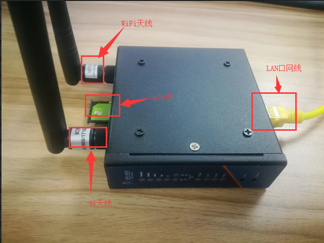 2、 接線:電腦通過網(wǎng)線連接 USR-806 的 LAN 口,WiFi 天線、全頻天線依次接在對應(yīng)的天線接口上