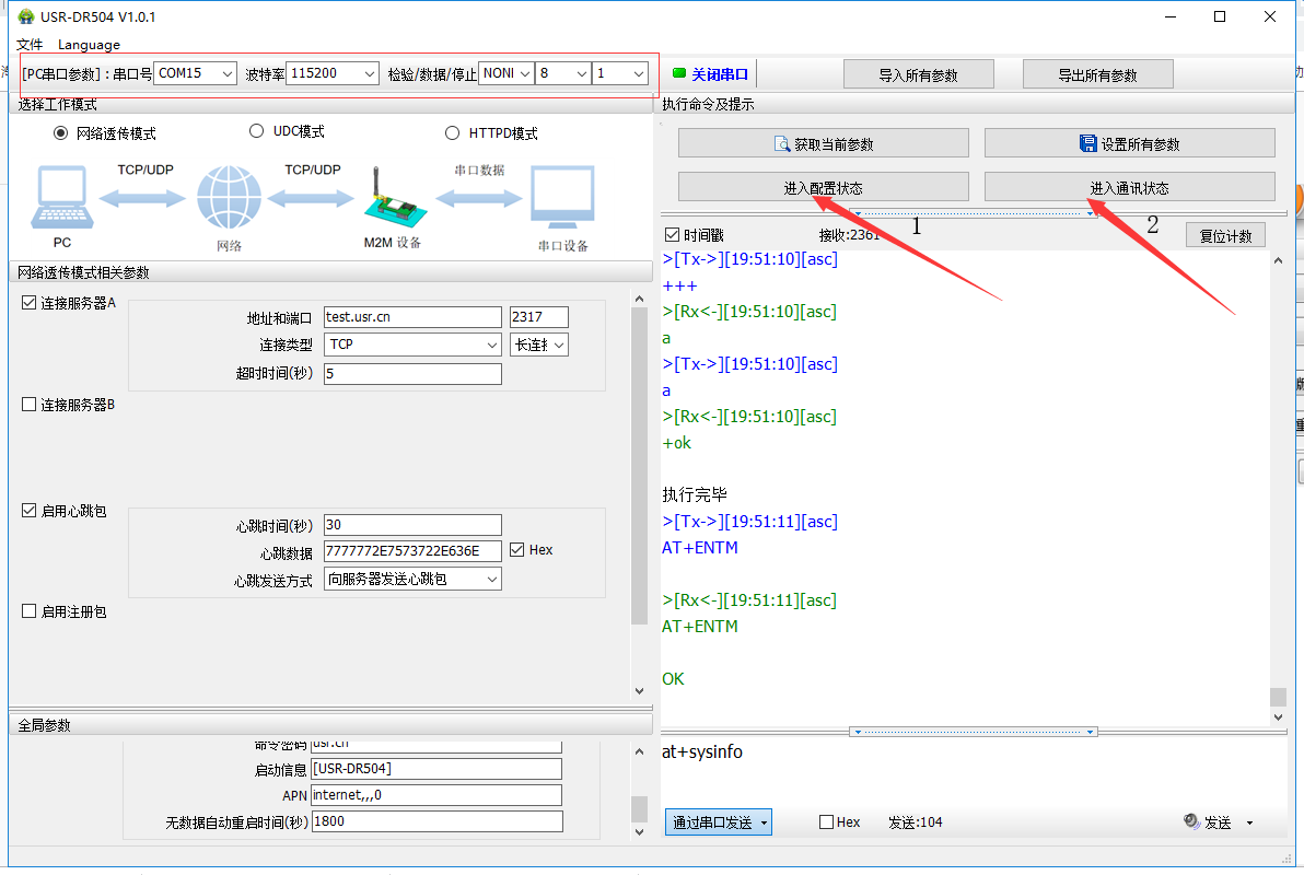 3. 是否在已經(jīng)進(jìn)入AT指令配置模式下重復(fù)點(diǎn)擊進(jìn)入配置狀態(tài)按鈕或者發(fā)送進(jìn)入配置模式的命令,點(diǎn)擊進(jìn)入通信狀態(tài)(多次間隔2秒嘗試),若能返回ok,則證明之前在AT指令配置狀態(tài)。