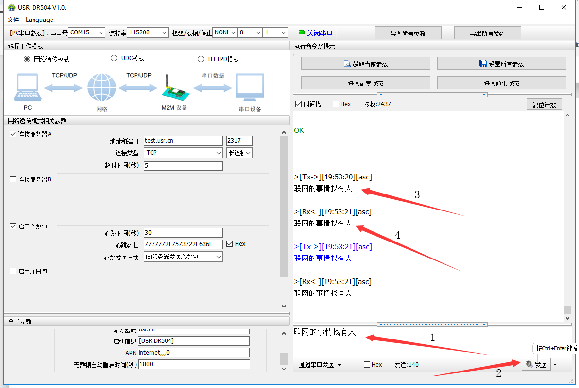5.DTU出廠默認(rèn)連接的是我司的測試服務(wù)器:test.usr.cn:2317;串口向服務(wù)器發(fā)送什么數(shù)據(jù),服務(wù)器就將接收到的數(shù)據(jù)返回到串口。通過串口發(fā)送<聯(lián)網(wǎng)的事情找有人>,可以看到服務(wù)器返回了相同的內(nèi)容,說明DTU工作是沒有問題的。如圖5