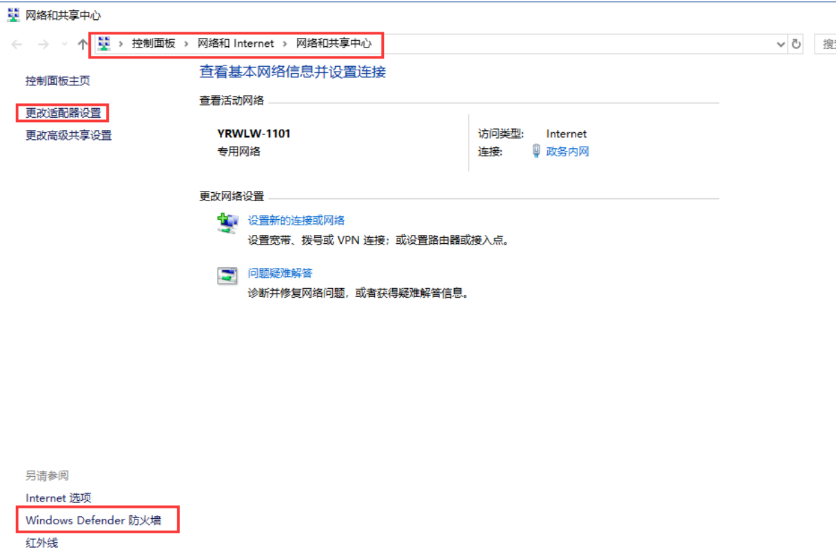 1、按路徑:控制面板》網絡和Internet》網絡和共享中心找到“windows防火墻”和“更改適配器設置”選項,關閉防火墻并禁用與本次測試無關的網卡。并關閉電腦殺毒軟件。
