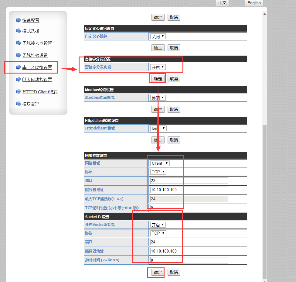 4. 網絡參數設置——>網絡模式選擇client,協議為tcp,端口為23,服務器地址為10.10.100.100