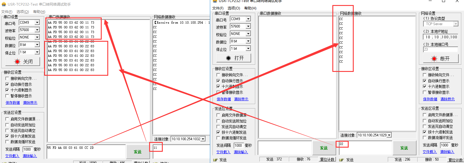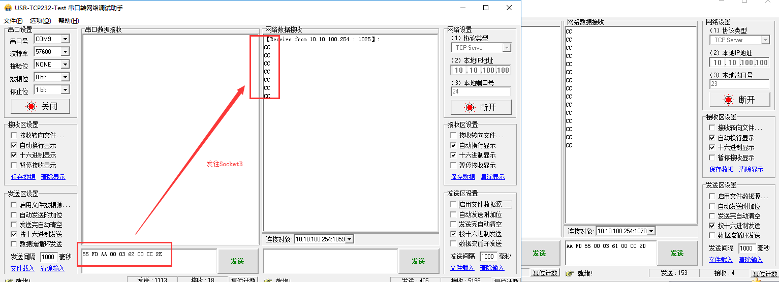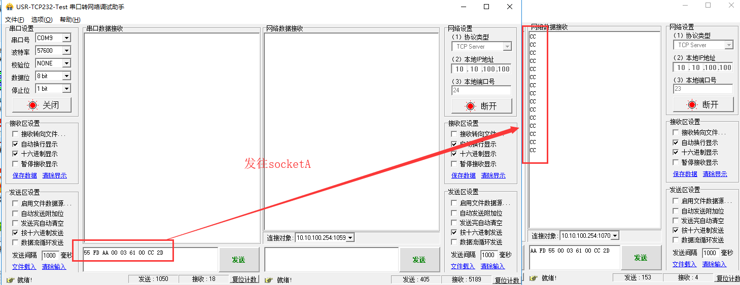 SocketA和B都重新斷開,重新連接,都可以給串口端發送數據!如圖所示