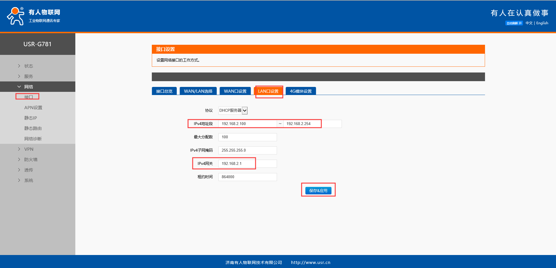 1>進入網絡---接口---LAN口設置,修改IPv4地址段和IPv4網關,例如下圖,都修改為192.168.2.XXX