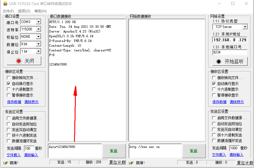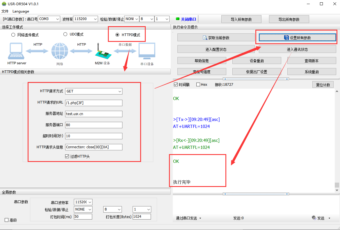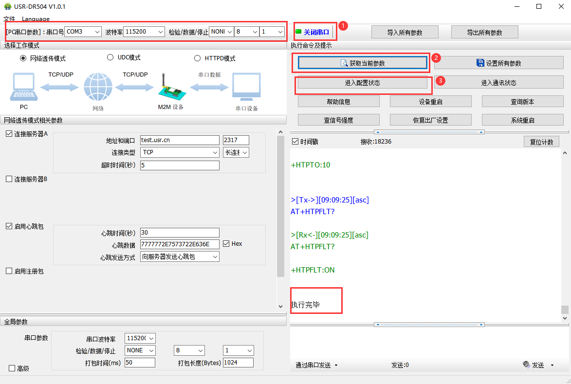 4. 打開串口后,先點擊進入配置狀態(tài),如果模塊能返回+ok的字符,說明電腦和模塊連接是沒有問題的;然后點擊進入通訊狀態(tài)如圖,做數(shù)據(jù)通訊測試。如果不返回+OK的話,請參考(步驟3)