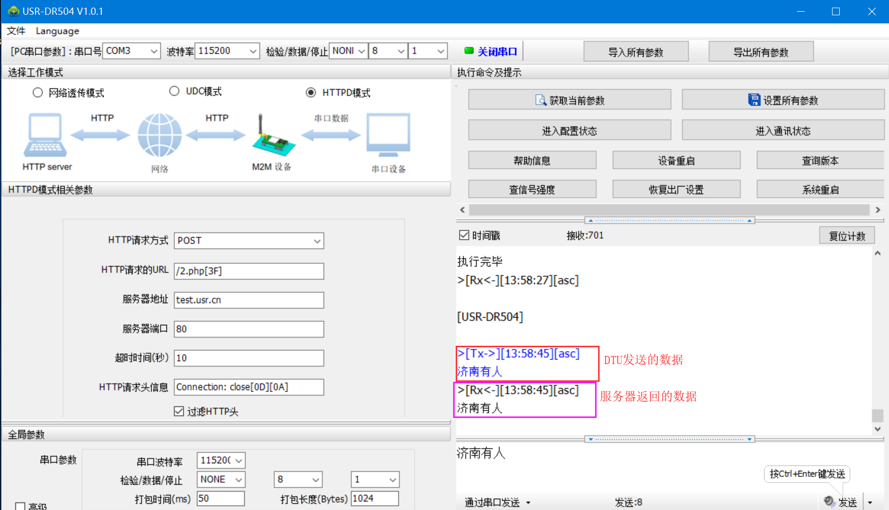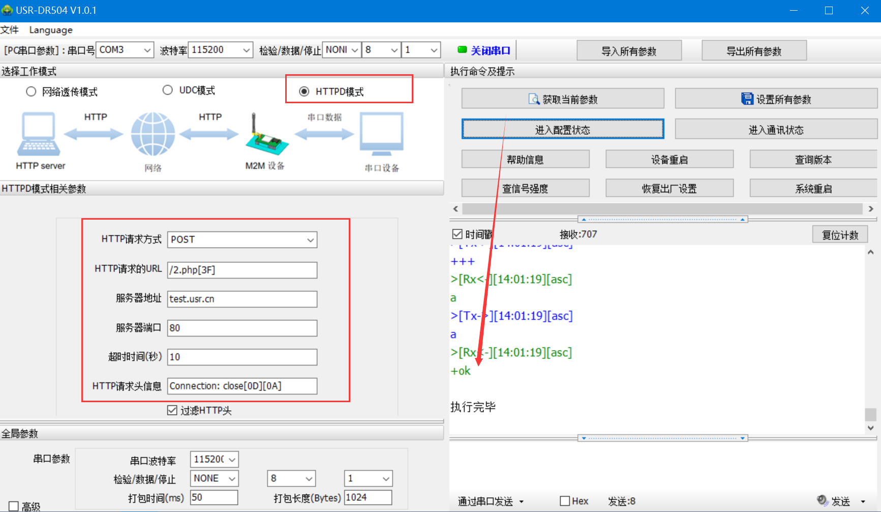 點擊進入配置狀態(tài),返回OK說明進入配置狀態(tài)成功-->配置HTTPD模式相關(guān)參數(shù)-->點擊設(shè)置所有參數(shù)-->點擊設(shè)備重啟