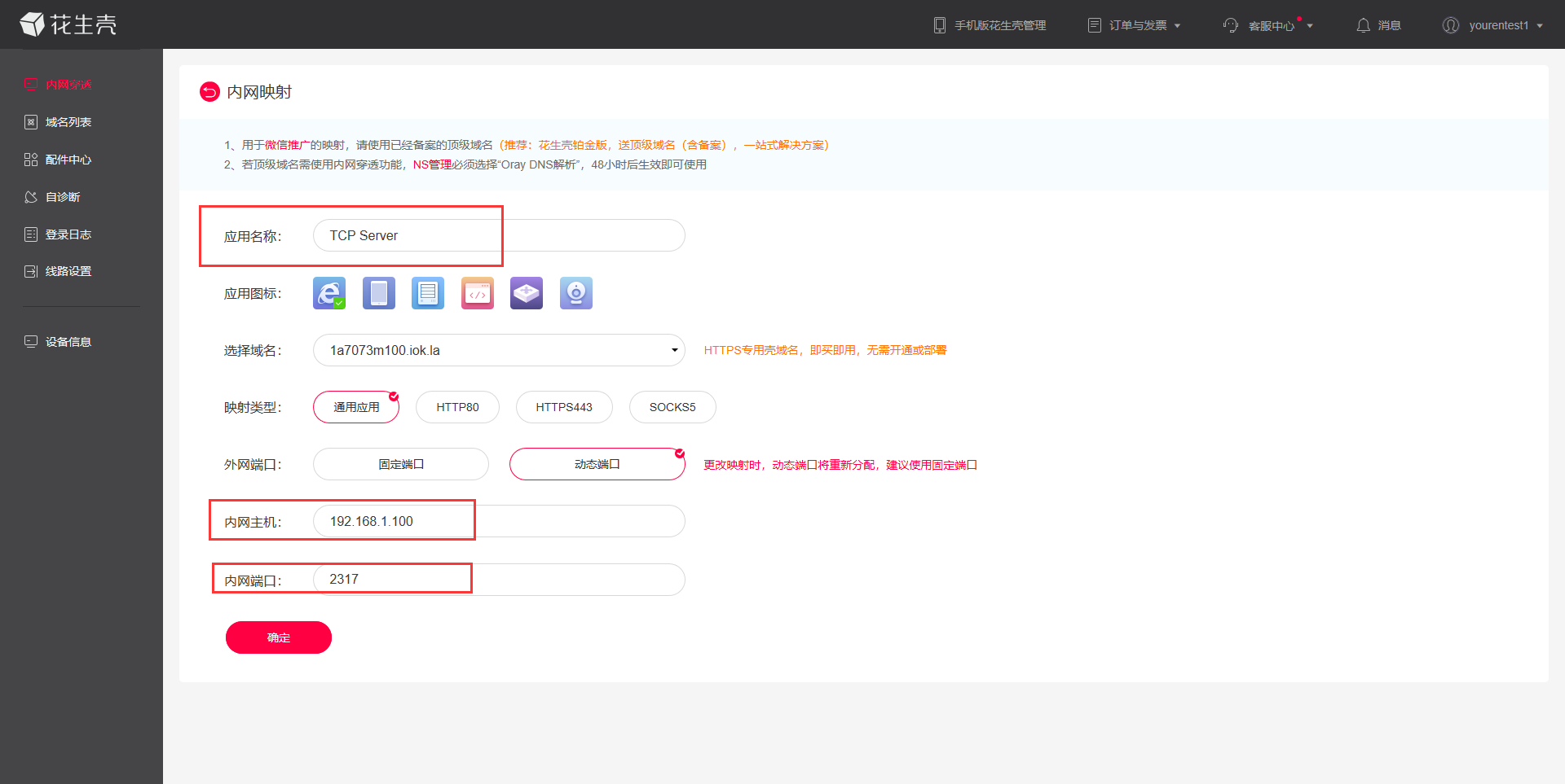 5、應用名稱可以自定義,以便于自己區分。應用圖標、應用域名、映射類型、外網端口可以根據自己需求來選擇,有些選項是收費的。(具體收費細則可咨詢花生殼的相關銷售和技術,本功能是第三方應用,我司不對其進行收費等業務辦理。)在這里如下設置。內網主機填寫路由器的LAN口內網設備的IP地址,端口是內網設備的監聽端口.設置完成后點擊確定。
