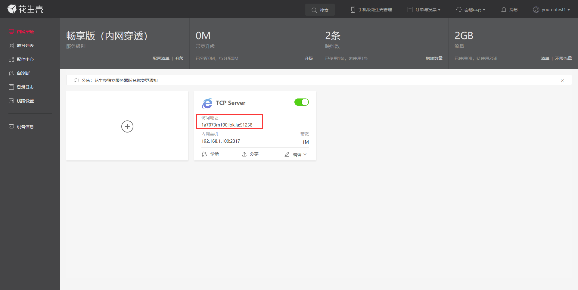 點擊確定后跳轉頁面,生成一路內網穿透,會顯示訪問地址,即外網訪問地址。如下所示:外網域名地址為:1a7073m100.iok.la,外網端口為:51258