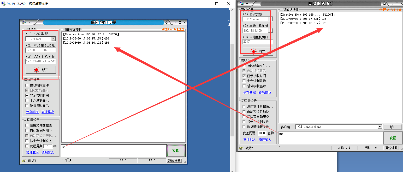 在可訪問公網的PC打開網絡調試助手,輸入映射的地址和端口并點擊連接,如下所示,建立連接,并可以雙向數據通信