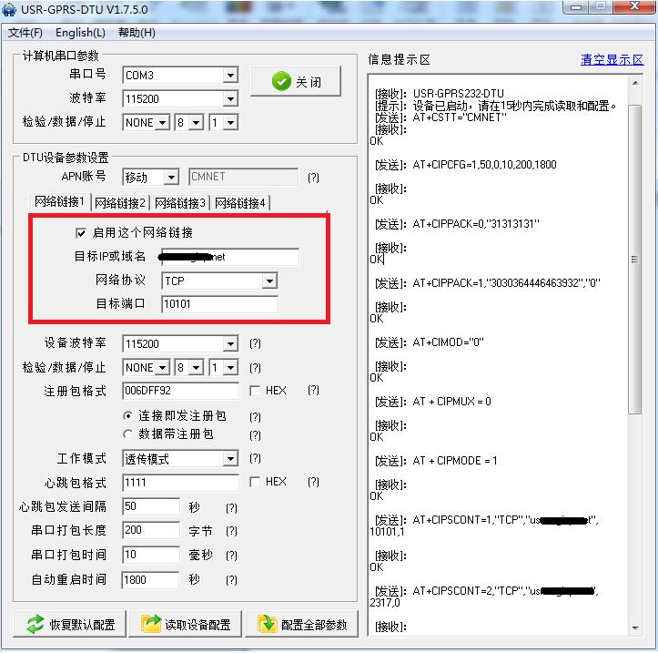 8、 設(shè)置DTU目的地址和端口號(hào):