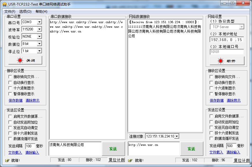 9、 通過(guò)調(diào)試助手建立TCPSERVER,串口和網(wǎng)絡(luò)端分別發(fā)送數(shù)據(jù)來(lái)測(cè)試: