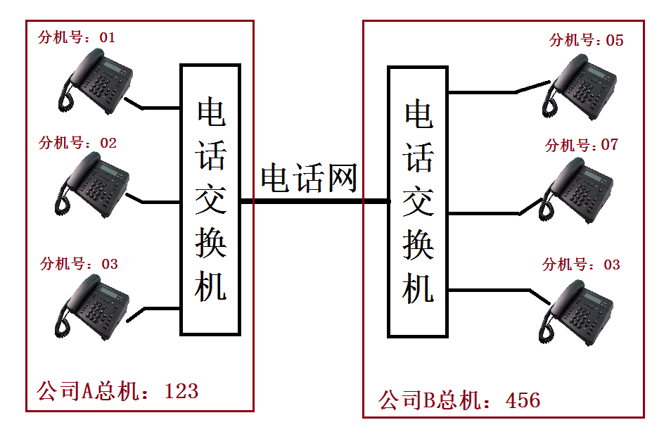如下圖所示,有兩個公司A和B,總機分別是123和456,兩個公司的分機號分別為01、02、03和05、06、03;那么如果A公司的01分機,想打電話給B公司的03分機,該如何撥打呢?