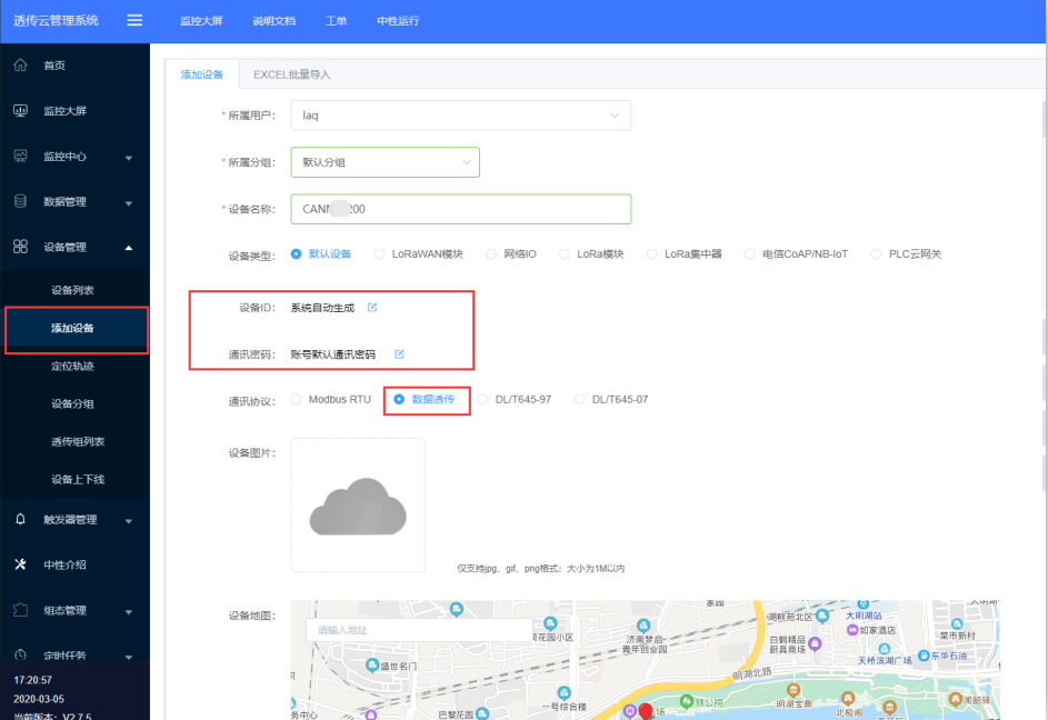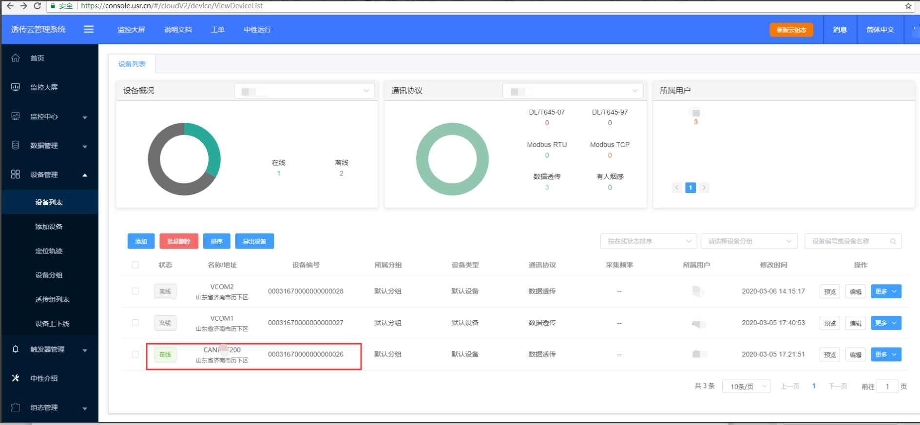 8. 回到透傳云即可看到設(shè)備上線成功。