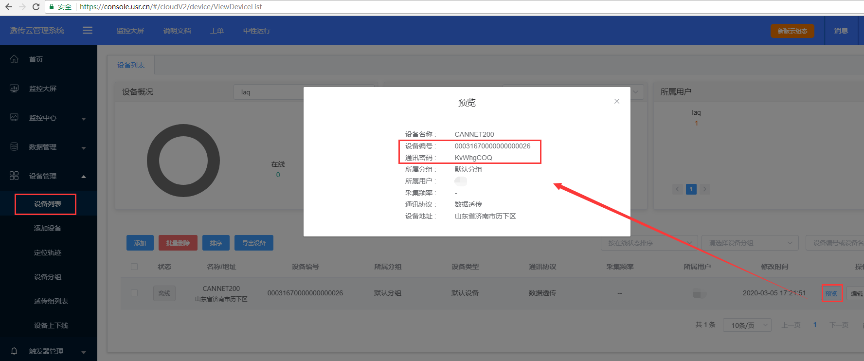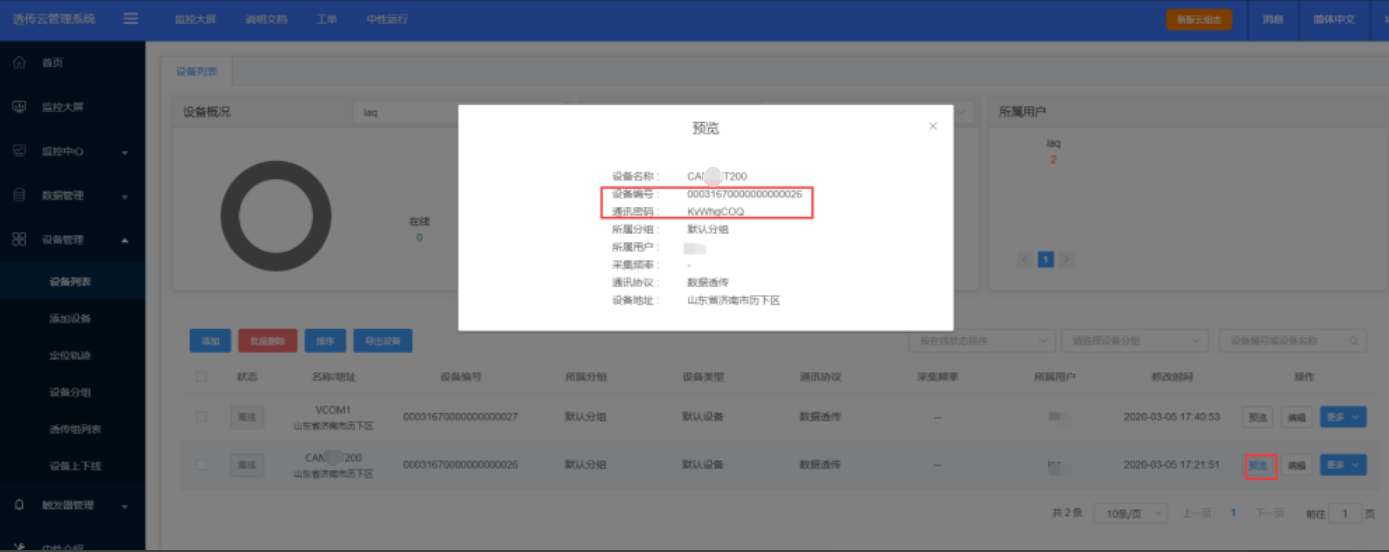 3. 進(jìn)入設(shè)備列表——預(yù)覽——查看設(shè)備編號與通訊密碼。