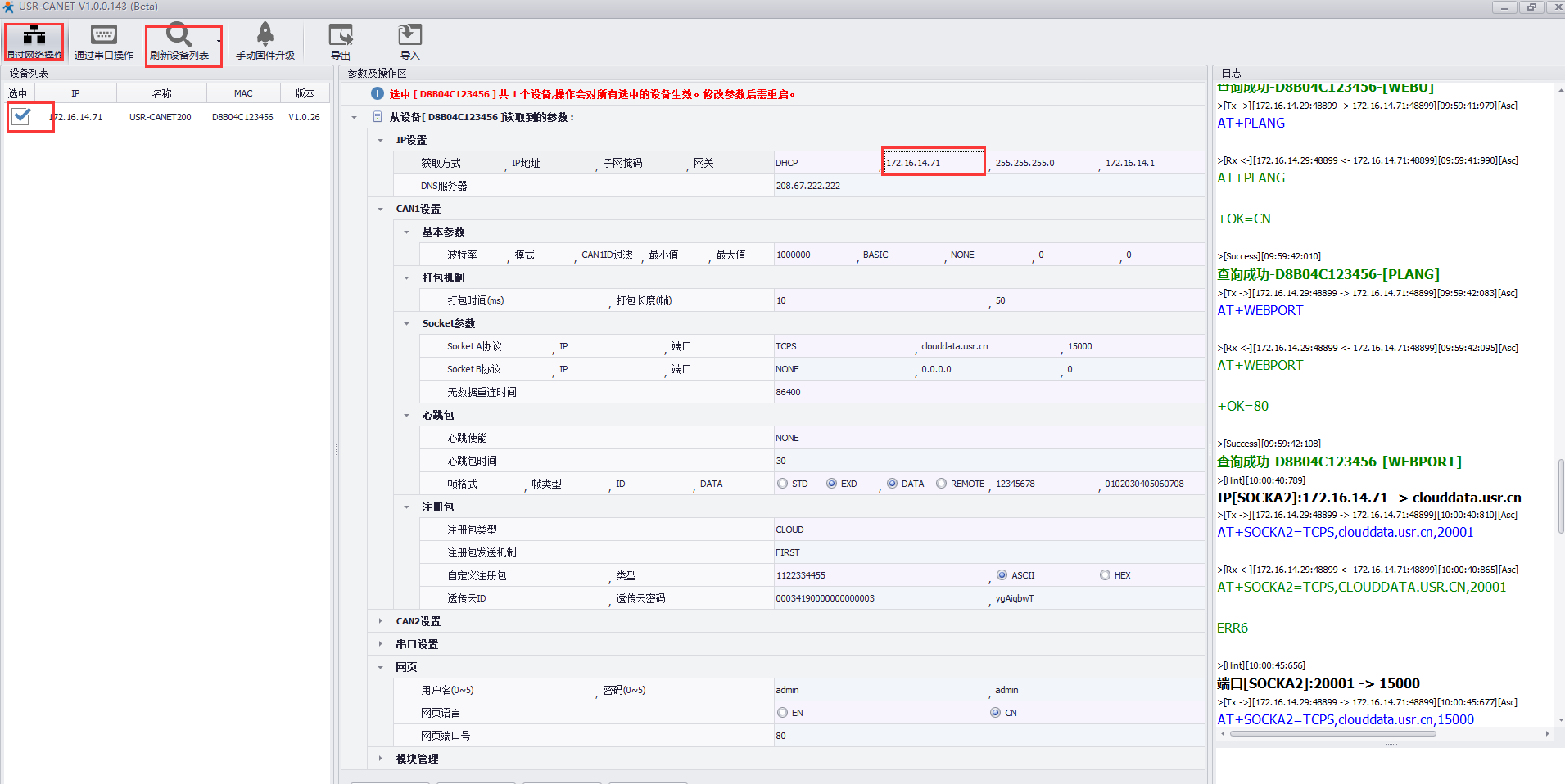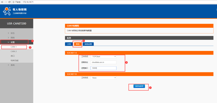 先通過端子給CANET200供電(5-36V),設(shè)備通過485轉(zhuǎn)USB串口線與PC相連接。配置前提為要將設(shè)備保持和PC在同一網(wǎng)段下,這里我們將設(shè)備與PC通過網(wǎng)線連接同一路由器,進(jìn)行測試。