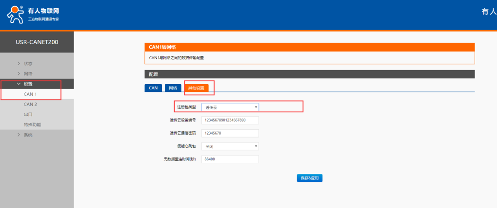 在其他設(shè)置中勾選透傳云,設(shè)備編號與通訊密碼進(jìn)入有人云設(shè)備列表查看按鈕中查看設(shè)備SN與通訊密碼,填寫至內(nèi)置網(wǎng)頁。