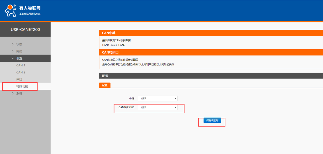 在設(shè)置——串口——特殊功能中必須關(guān)閉CAN轉(zhuǎn)RS485功能(此功能為協(xié)議轉(zhuǎn)換 功能,我們現(xiàn)在測試所使用的為透傳功能)