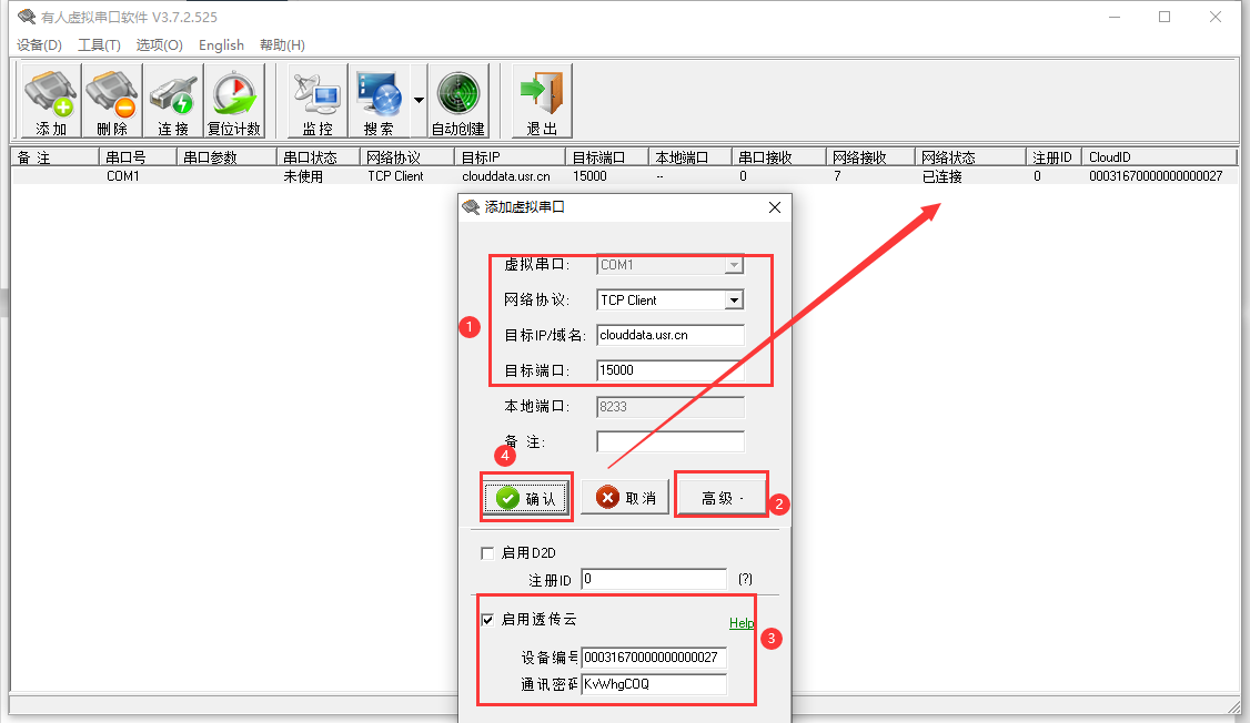 9.通過虛擬串口軟件,使虛擬設(shè)備在透傳云中上線。端口要選擇一個未被占用的端口,連接目標(biāo)IP與端口:clouddata.usr.cn,15000,在高級中啟用透傳云,將設(shè)備編號與通訊密碼填寫入,點(diǎn)擊確認(rèn)。