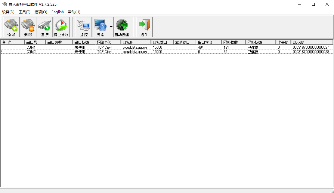 在與設(shè)備正常連接到云端之后,我們再建立兩個虛擬設(shè)備,這里使用VCOM這個軟件建立虛擬串口連接云端進(jìn)行模擬虛擬設(shè)備。三個設(shè)備都成功在云端上線后,將三個設(shè)備建立透透傳組,成功建立后。打開三個串口調(diào)試助手,一個連接CANET200的串口,兩個串口連接虛擬串口,即可看到CANET200與兩虛擬設(shè)備之間可以實(shí)現(xiàn)透傳通信。