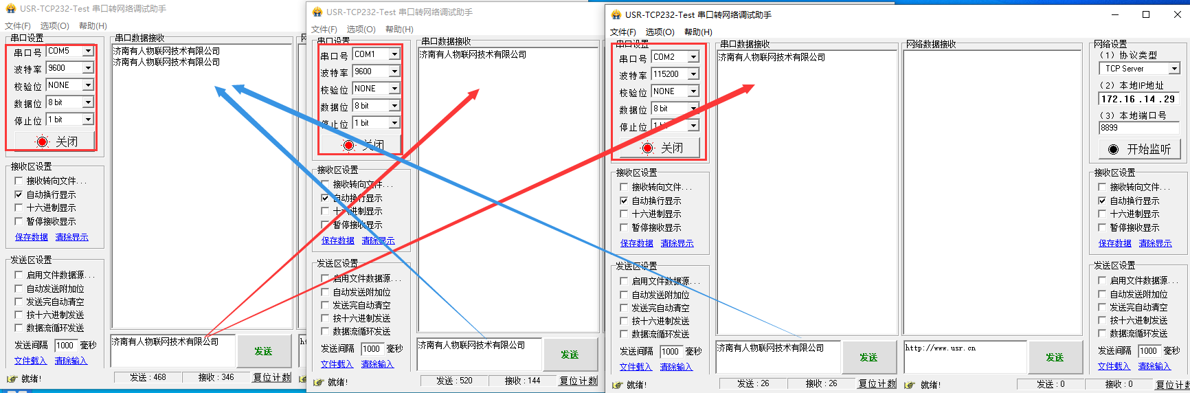 10.完成透傳組建立后,打開三個串口調(diào)試助手,兩個調(diào)試助手串口端連接虛擬串口,一個調(diào)試助手串口端連接CANNET200,使三串口參數(shù)相同,即可實(shí)現(xiàn)一對多的透傳測試。