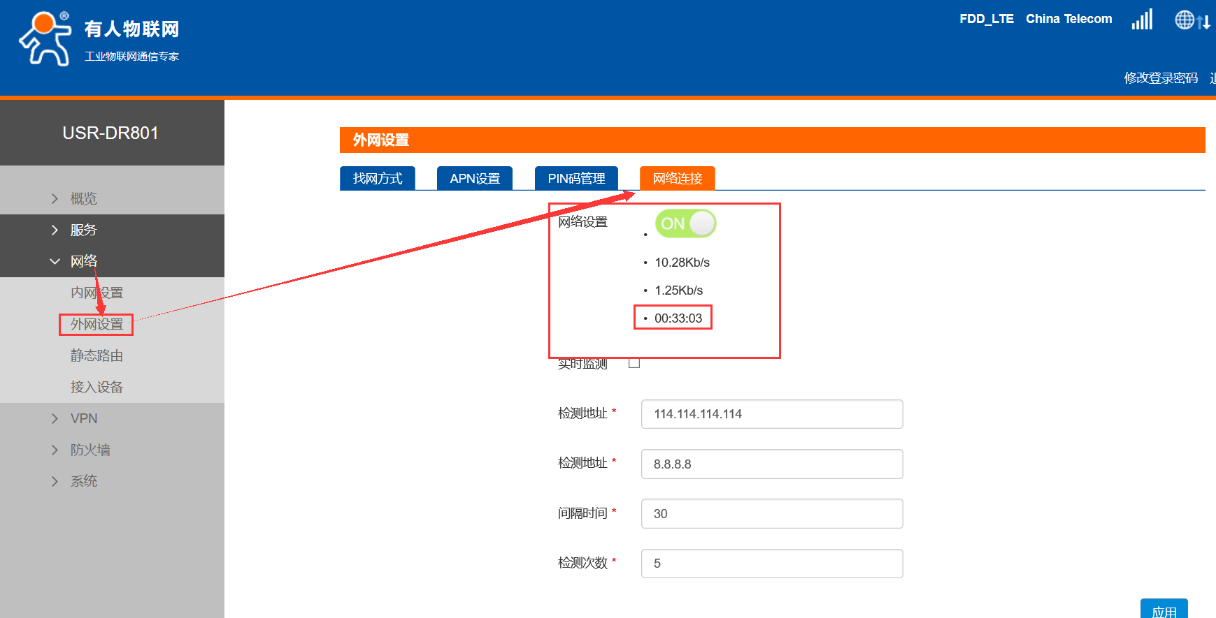 打開網絡--外網設置--網絡連接可以打開或關閉 4G 網絡連接,查看實連接時間等等