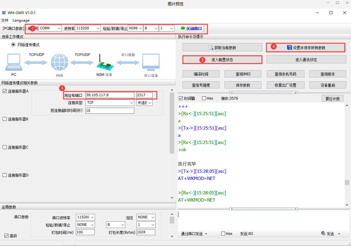 (2)打開串口——進入配置狀態——設置相關參數——設置并保存所有參數
