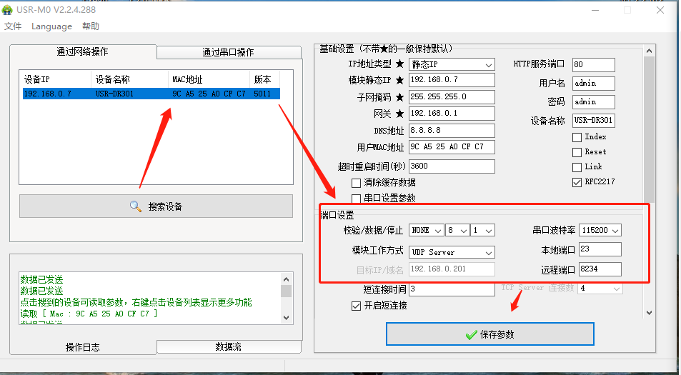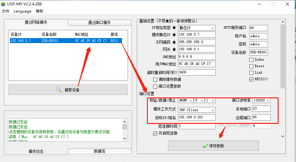 串口端選擇正確的串口(可在設(shè)備管理器--端口處查看)以及串口參數(shù),301出廠默認(rèn)115200,N,8,1。
