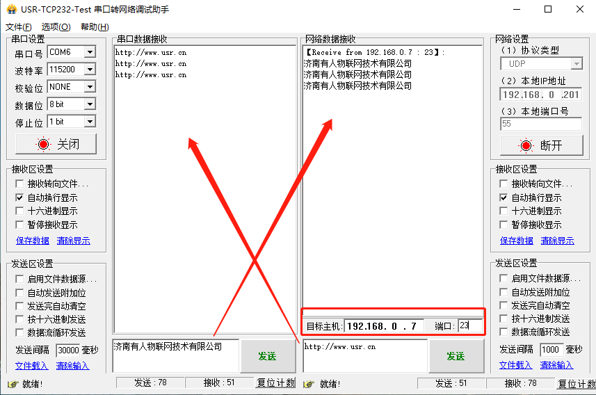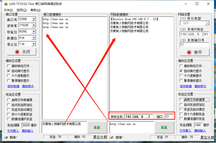 點(diǎn)擊“連接”后,需要將目標(biāo)主機(jī)和端口改為301的Ip和本地端口,然后串口往網(wǎng)絡(luò)發(fā)一包數(shù)據(jù)建立連接后,網(wǎng)絡(luò)即可往串口發(fā)數(shù)據(jù)。