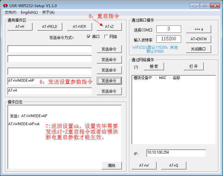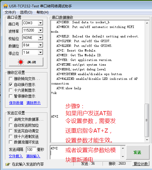 2.3:如果發送AT指令設置參數,設置之后,發送AT+Z重啟指令重啟生效。