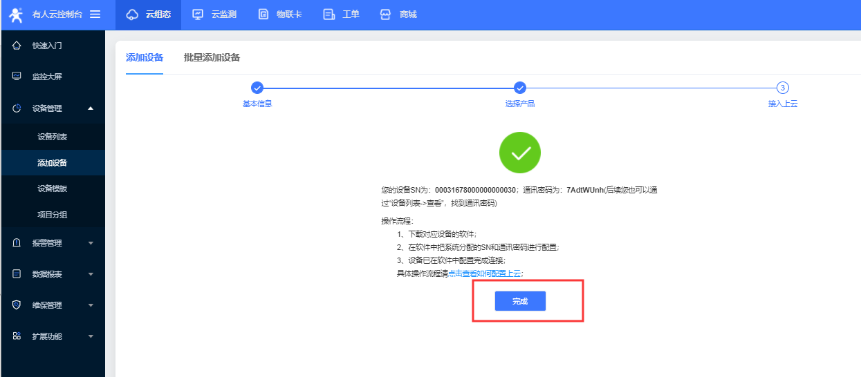 (3)設置有人云的地址:clouddata.usr.cn 端口15000;在有人云查看設備編號和通訊密碼,SN即設備編號,將SN和通訊密碼分別復制到設備軟件的設備編號和通訊密碼;