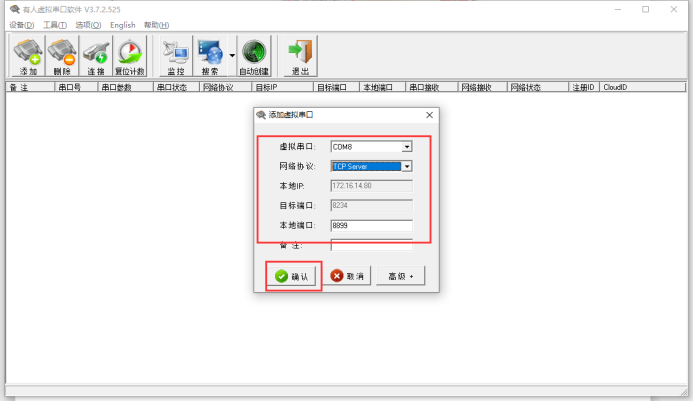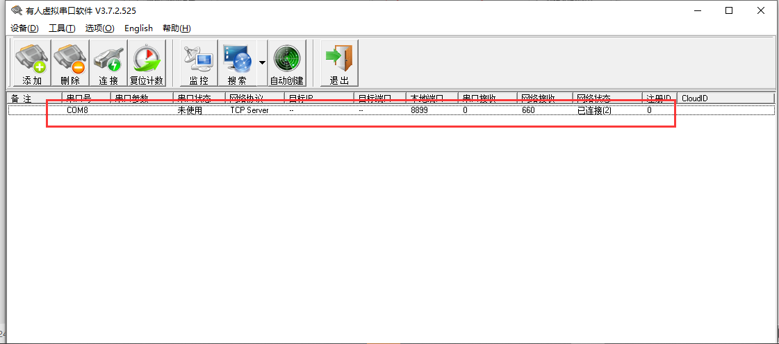 11.使用虛擬串口軟件建立TCP Server網絡監聽(使用時需要將Test調試助手軟件創建的Server監聽關閉,不能同時使用),且串口必須為未被占用的串口號。