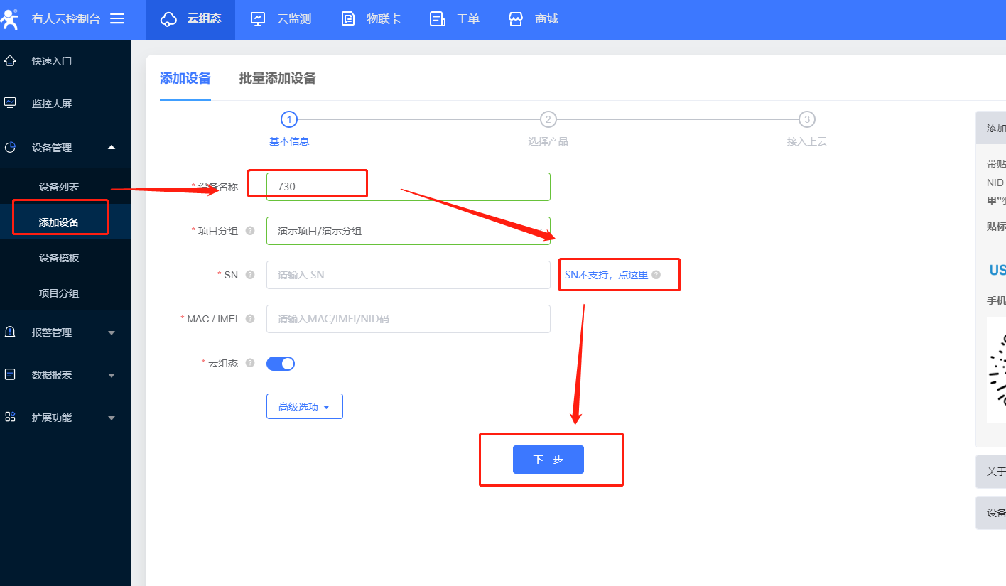 (2) 730目前不支持SN碼添加,點(diǎn)擊右側(cè)“SN不支持,點(diǎn)這里”,設(shè)備ID和通訊密碼可以自動(dòng)生成,設(shè)備ID20位,通訊密碼必須是8位(支持修改密碼)。