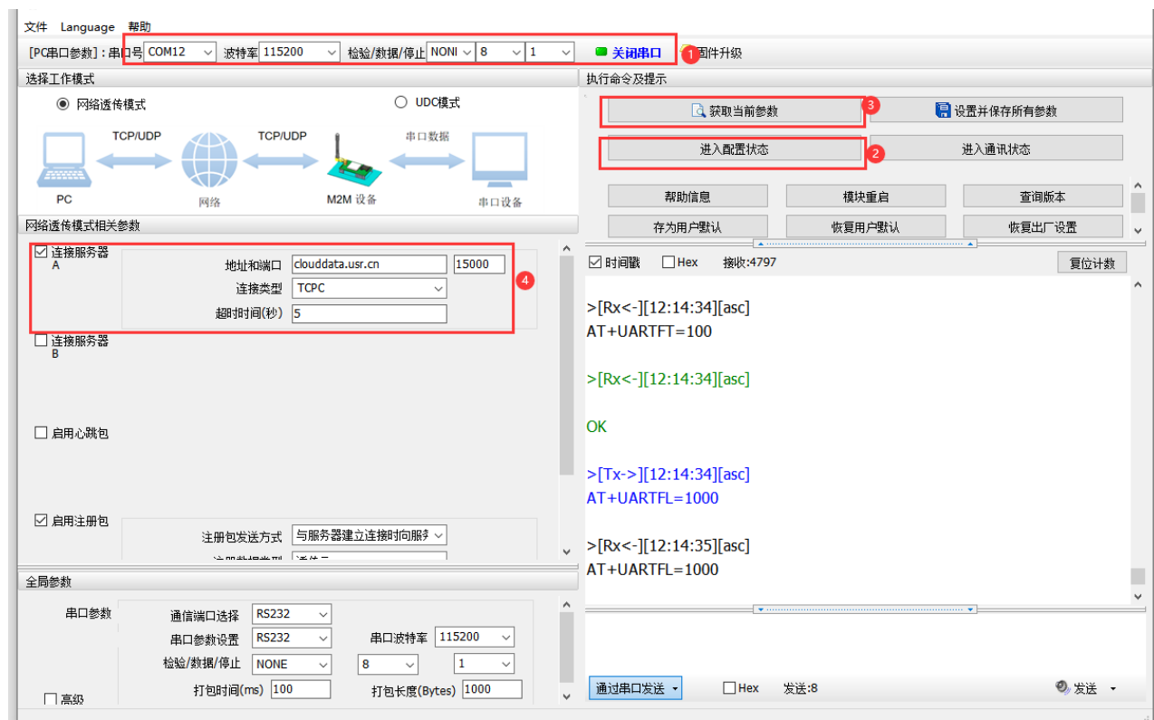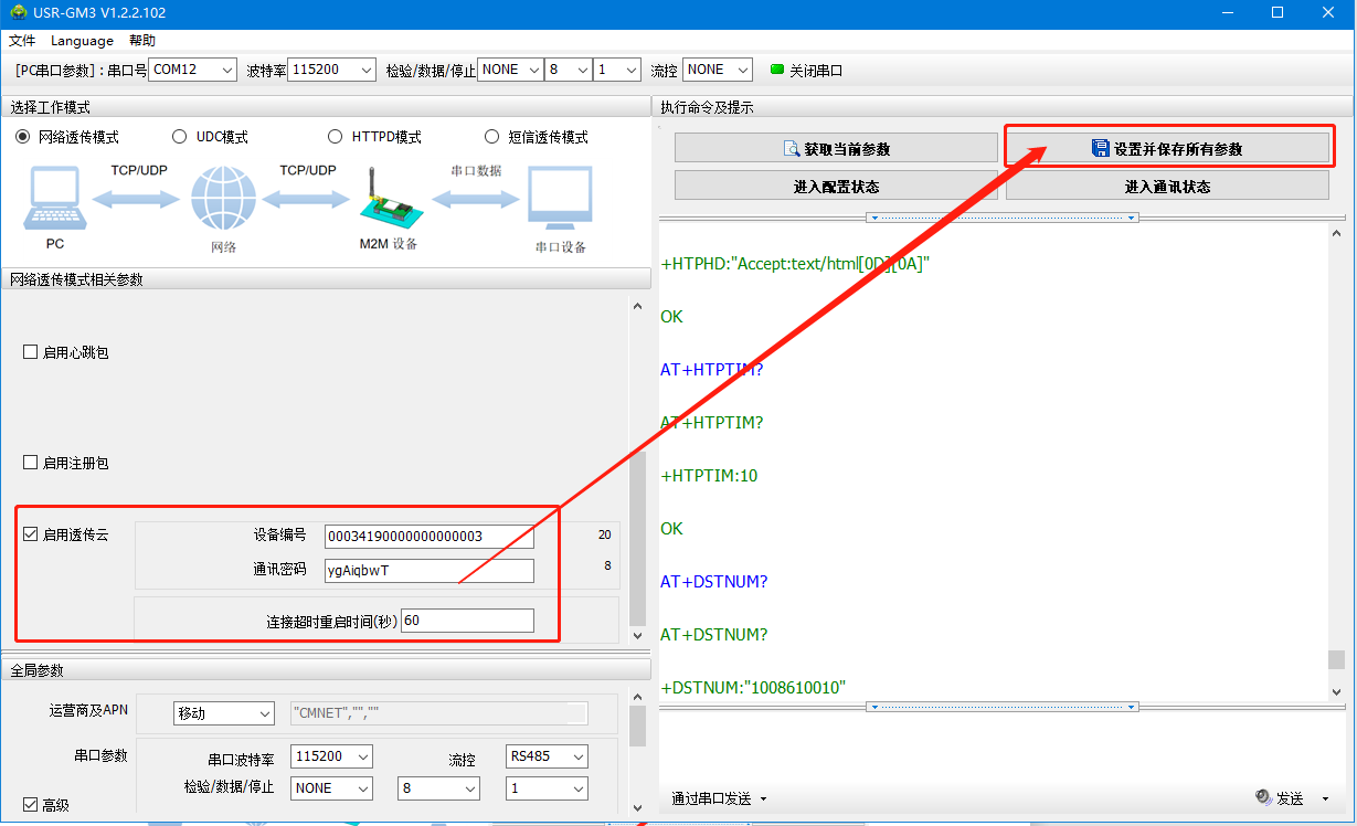 6、啟用注冊(cè)包類型選擇透?jìng)髟疲O(shè)備編號(hào)和通信密碼為在云平臺(tái)添加設(shè)備生成的設(shè)備編號(hào)和通信密碼,點(diǎn)擊確定設(shè)置所有參數(shù)。