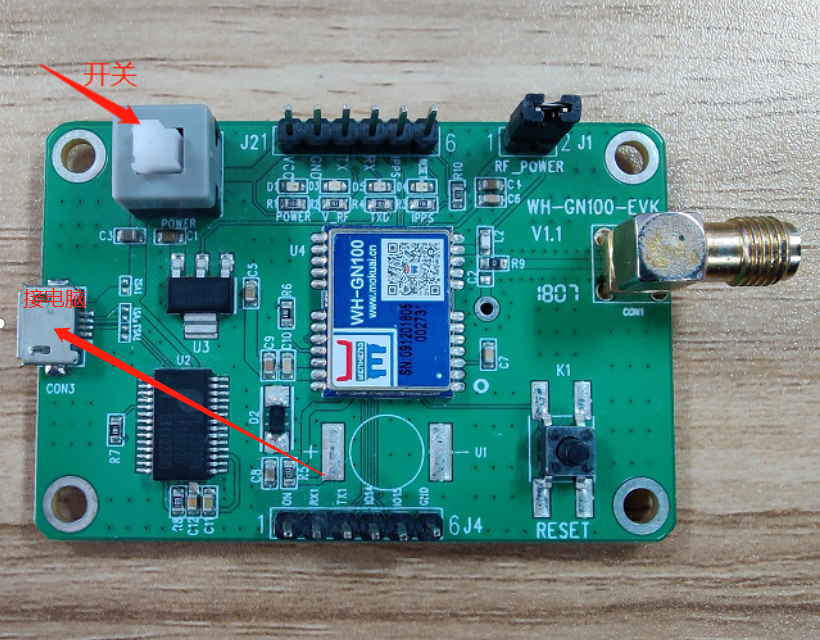 用接口為USB的連接線連接GN100的升級(jí)口,并連接電腦,然后按下GN100的開關(guān),如下圖: