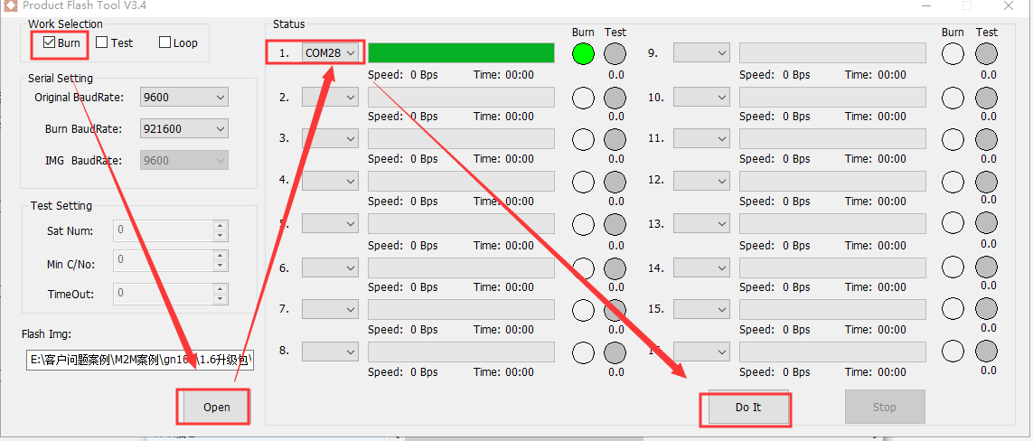 3、勾選Burn——點(diǎn)擊Open選擇固件——選擇串口號(hào)(可以在設(shè)備管理器查看)——點(diǎn)擊Do It,看到綠色進(jìn)度條加載完成以后關(guān)閉軟件即可