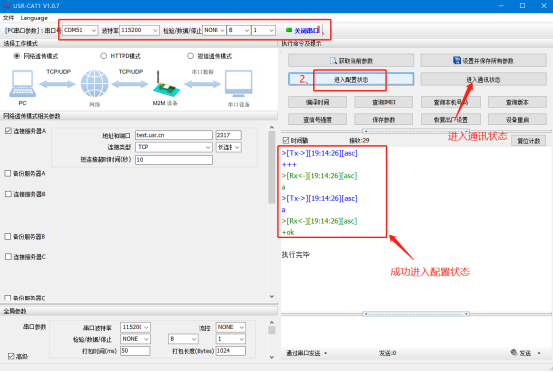 打開串口后,先點擊進入配置狀態,如果模塊能返回+ok的字符,說明電腦和模塊連接是沒有問題的;然后點擊進入通訊狀態,做數據通訊測試。